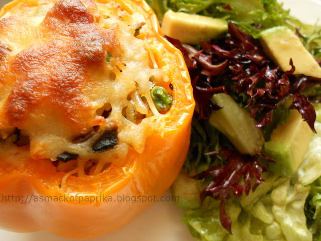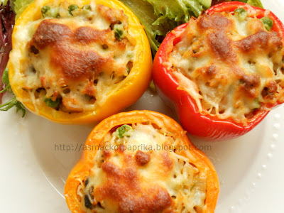 Preheat oven to 350 F. Spoon the cooked chicken rice into the bell peppers, top with cheese and place into a baking pan/dish. Add 1/4 cup of water into