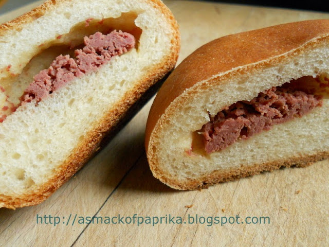 Braunschweiger is a type of liverwurst or liver sausage. We normally had ours sliced and added into sandwiches together with some mustard and cheese or some sliced tomatoes, pickles and onion. Or we would spread it on bread or crackers. Today it became the buns' filling. Heating up is easy, just put into the bread toaster ...viola! it is ready to eat in minutes. The best part is the bread stays crunchy even after heating it the next day.