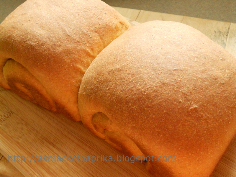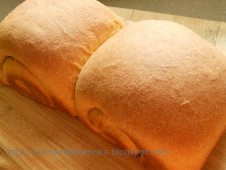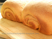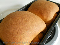 I baked this yesterday before the Peachy Cream Cake. I wanted to bake wheat bread for a long time, just didn't come to it. We finally bought one bag of whole wheat flour this week. I was told and also read somewhere that whole wheat contains vitamins, minerals and carbohydrates that help maintain good health. Whole wheat tends to taste a bit bitter. For people who do not like the bitter taste, some chefs suggested adding some orange juice... On the package of the whole wheat flour that we bought, it mentioned that the whole wheat flour can be incorporated with all purpose flour. They suggest starting at 25% and then working your way up to 50% of the total flour required.