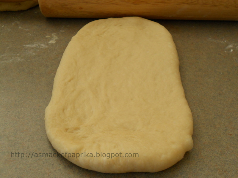 Use a roller pin and roll the dough into a rectangular shape. (see picture on the left)
